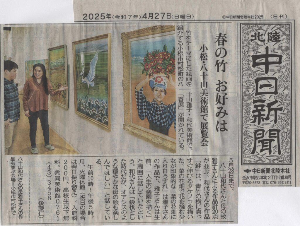 北陸中日新聞(2025年4月27日付) 春の竹 お好みは 小松・八十山美術館で展覧会 竹をテーマにした絵画を紹介する小松市村松町の八十山雅子・和代美術館で、「春展」が開かれている。5月28日まで。 八十山和代さんと母の故......
