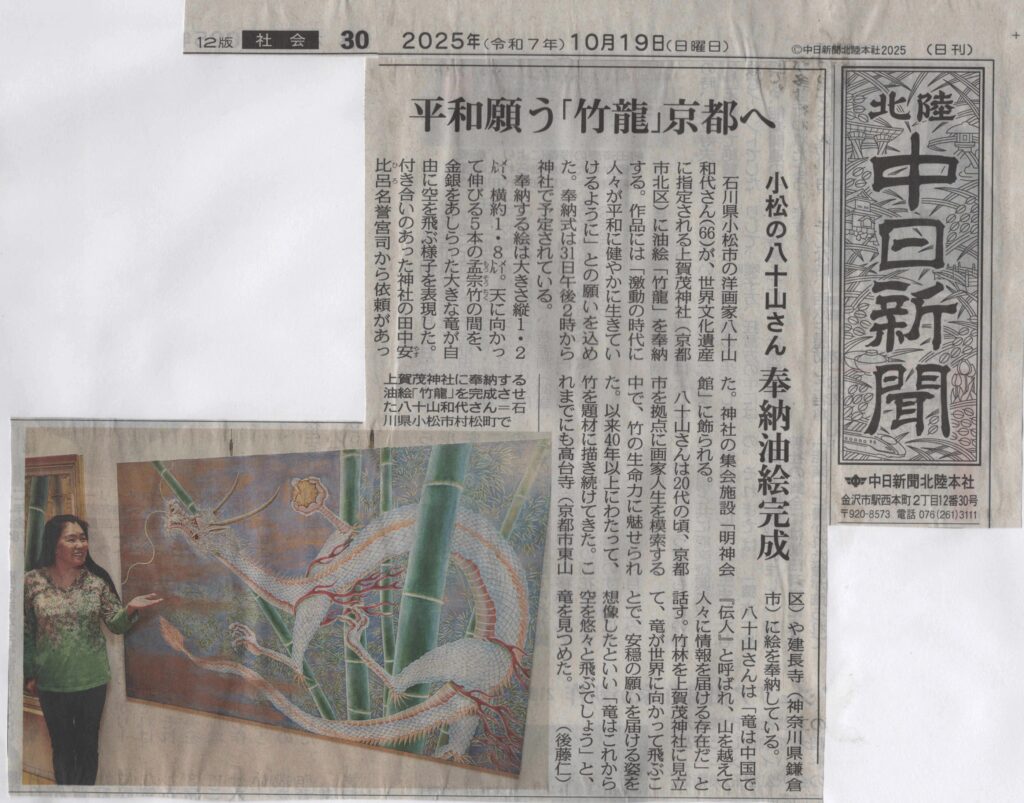 北陸中日新聞(2025年10月19日付) 平和願う「竹龍」京都へ 小松の八十山さん 奉納油絵完成 石川県小松市の洋画家八十山和代さん(66)が、世界文化遺産に指定される上賀茂神社(京都市北区)に油絵「竹龍」を奉納する。 ......