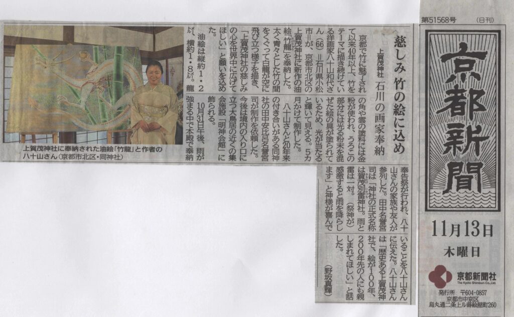 京都新聞(2025年11月13日付) 慈しみ 竹の絵に込め 上賀茂神社 石川の画家奉納 京都で竹に魅了されて以来40年以上、竹をテーマに描き続けている洋画家八十山和代さん(66)=石川県小松市=が、京都市北区の上賀茂神社......