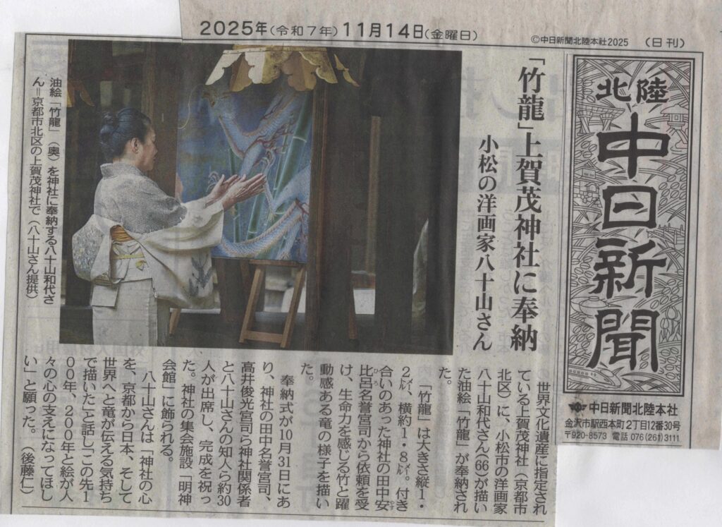 北陸中日新聞(2025年11月14日付) 「竹龍」上賀茂神社に奉納 小松の洋画家八十山さん 世界文化遺産に指定されている上賀茂神社(京都市北区)に、小松市の洋画家八十山和代さん(66)が描いた油絵「竹龍」が奉納された。 ......